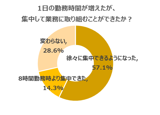 「ルーチン業務がないため変わらなかった」 「その時間しかできない仕事に集中して取り組めた」 「電話がこない時間に業務に集中できた」 「週の勤務時間は同じなので、変化はなかった」