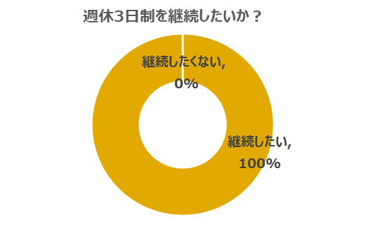 アンケートの回答から、実際に週休3日制を実施した社員全員が満足しているという結果となりました。また、周囲からも週休3日制を導入していることについて「先進的だ」「うらやましい」「驚いた」といった声が寄せられており、全員が今後も継続したいという意思を示しています。