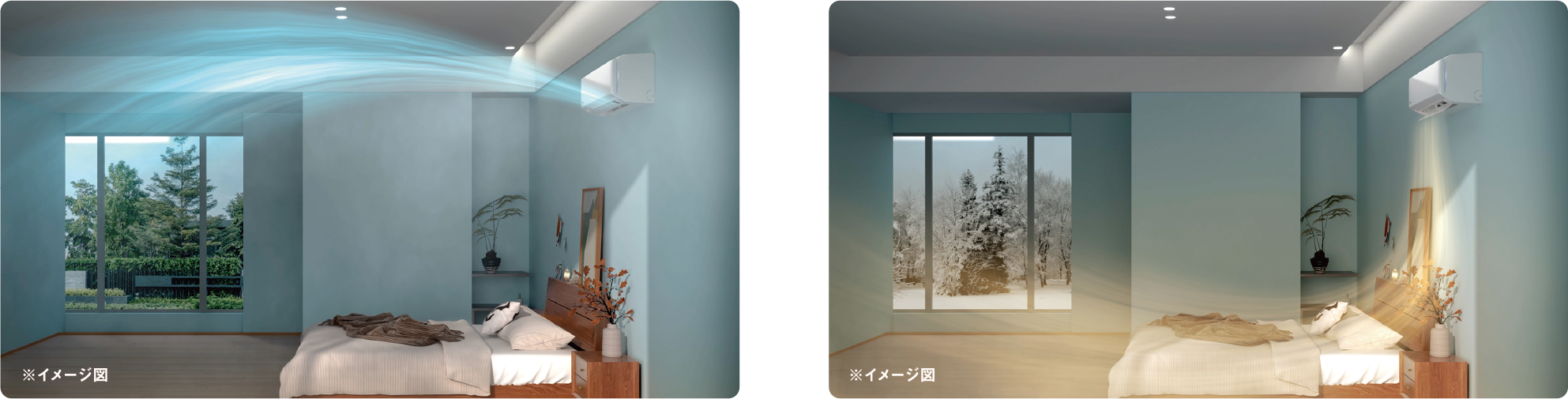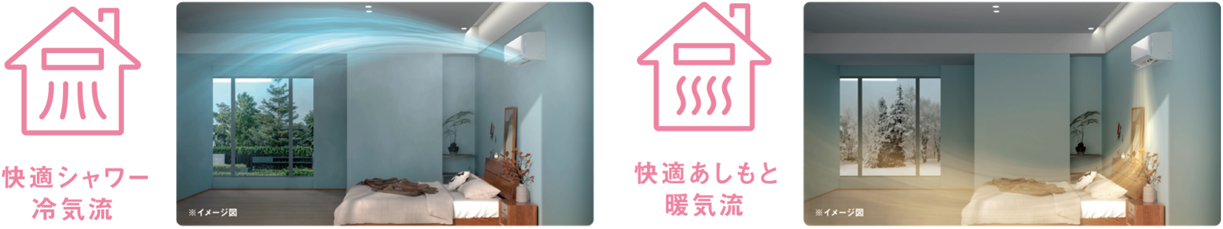 天井に沿って冷たい風を送り、部屋の奥までスッキリ冷やす「快適シャワー冷気流」、天井に上がりやすい暖気をおさえこみ、温風を足元へ届ける「快適あしもと暖気流」を搭載。また、あてたいエリアに向けて風を届ける「エリア指定送風」など、快適な空間を実現する機能を採用しました。