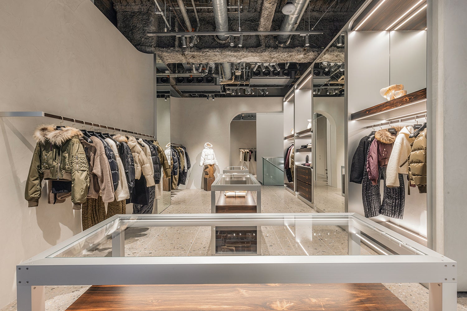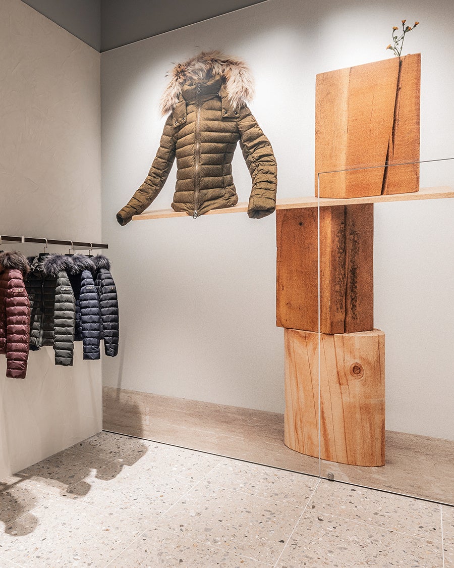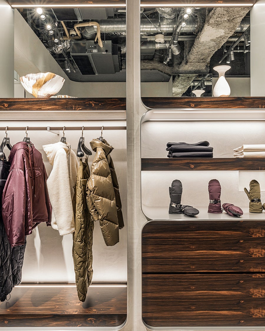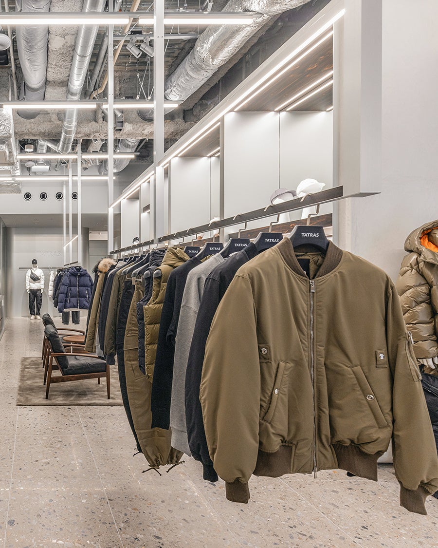 内装は〈TATRAS〉が作るダウンジャケットにも当てはまる、コントラストの美をテーマに、石や木などの自然物と、コンクリート・ステンレスなどの人工物とを組み合わせたデザインで設計されています。〈TATRAS〉ブランドの背景にあるイタリアと日本の融合を意識したクリーンでモダンな店内には、日本の伝統工芸品である「朝日焼」の一点もの作品が複数飾られると同時に、〈TATRAS〉のアイコニックなダウンジャケットをアートに捉えて作成したオリジナルの什器もディスプレイされ、アートギャラリーのような空間にて、〈TATRAS〉の世界観を堪能いただけます。 メインフロアとなる1階は