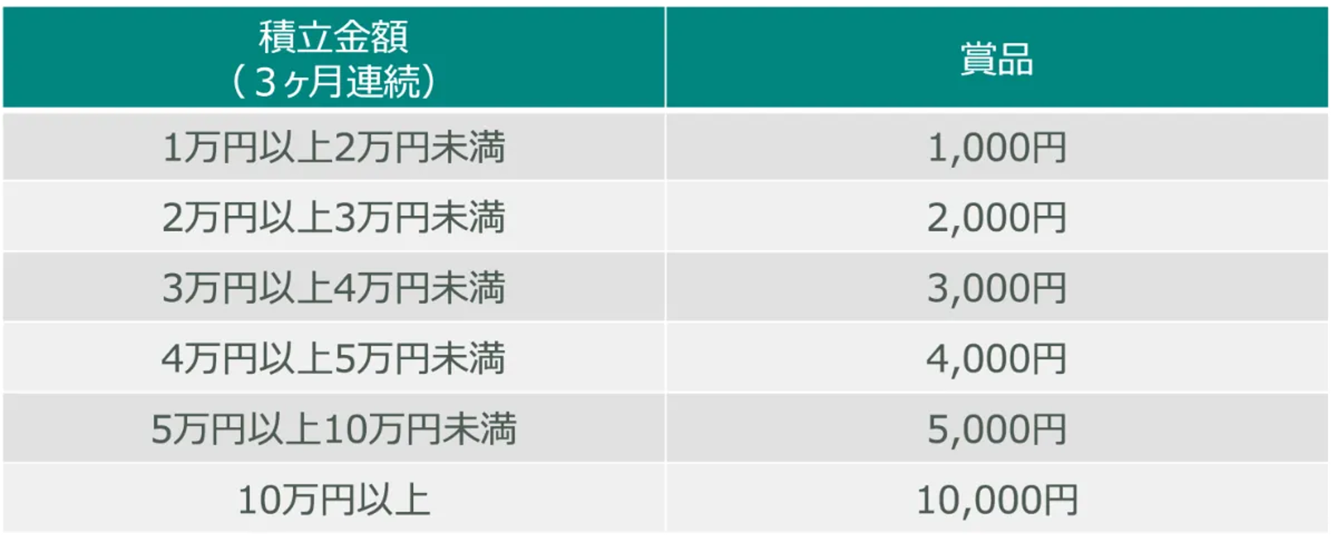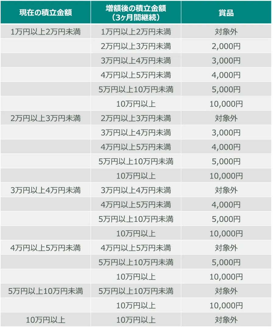 2022年6月12日から2022年7月10日までの間に積立金額を賞品に定める一定金額以上増額し、2022年8月8日から3ヶ月間継続して買い付けを行なった方