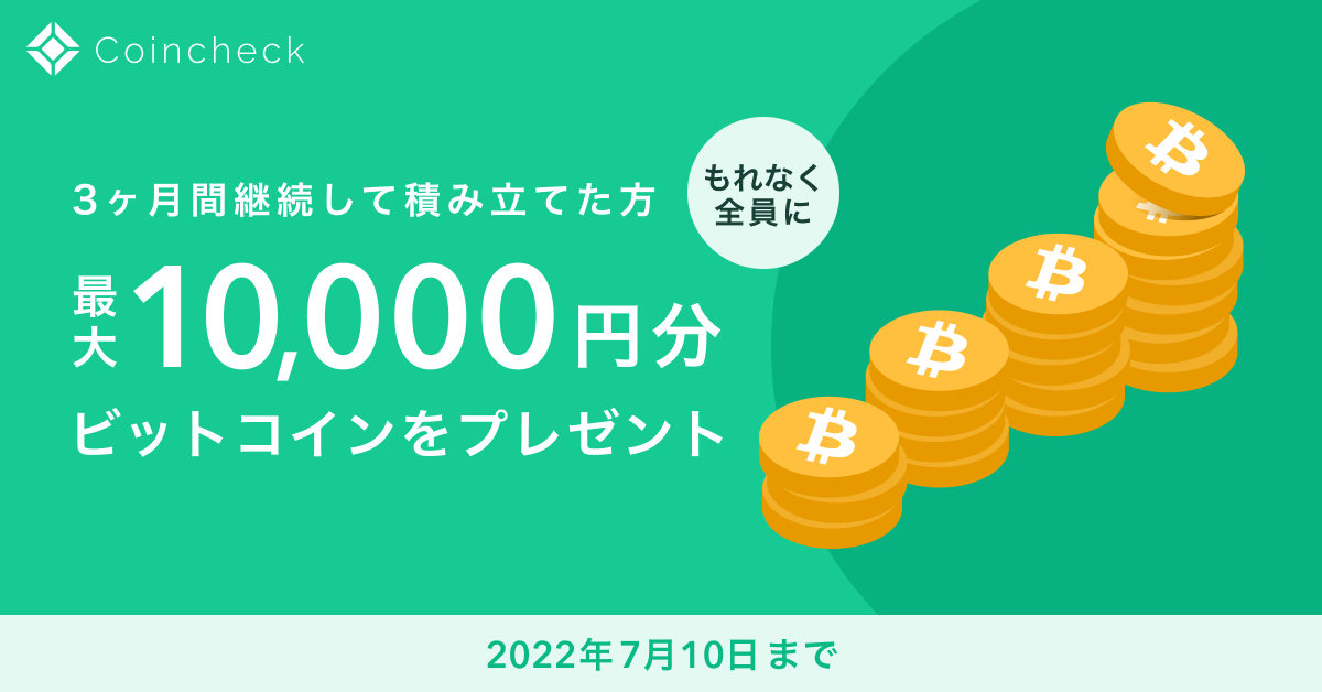 コインチェック株式会社(以下、コインチェック)が提供する暗号資産積立サービス「Coincheckつみたて」では、2022年6月12日より、積立金額に応じて最大1万円相当のBTCがもらえるキャッシュバックキャンペーンを実施いたします。本キャンペーンは、新規のお客様だけでなく、一度「Coincheckつみたて」を退会したお客様や現在積立中のお客様もご利用いただけます。