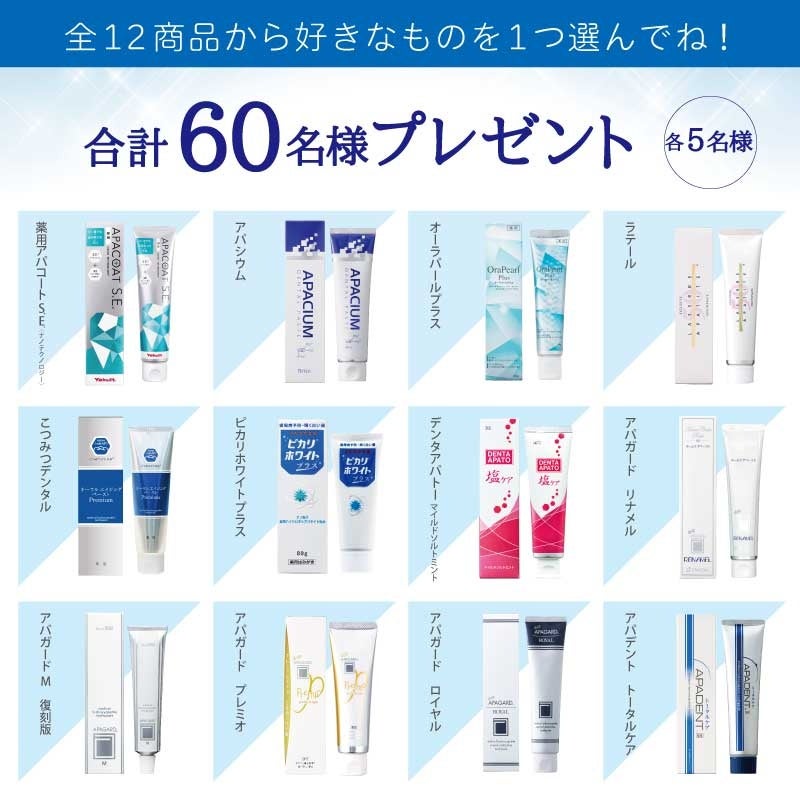 また、今回当選されなかった方にも全員に、「アパガードMプラス」の2gサンプルをプレゼントします。キャンペーンを通じ、配合成分「薬用ハイドロキシアパタイト」について知っていただくとともに、健康的で美しい歯の大切さを改めて考える機会にしていただければと存じます。