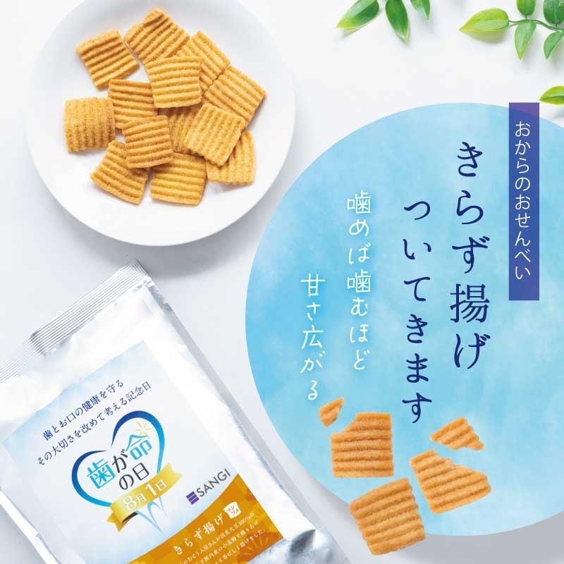 今年も歯みがき剤に加え、おからのおせんべい「きらず揚げ」も一緒にプレゼントします。噛むことは健康への第一歩。噛む習慣が少ない人にも、噛むことを楽しく感じてもらえるような、カリッポリッとした食感がクセになるおからを揚げた硬いお菓子です。