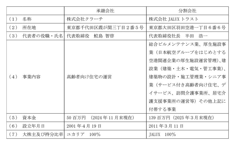 株式会社ユカリア(本社:東京都千代田区、代表取締役社長:三沢 英生、以下「ユカリア」)の完全子会社である株式会社クラーチ(本社:東京都千代田区、代表取締役社長:鮫島 智啓、以下「クラーチ」)が、株式会社JALUXトラスト(本社:東京都大田区、代表取締役社長:半田 浩一、以下「JALUXトラスト」)のシニア関連事業を簡易吸収分割により取得することにつき、本日クロージングに必要な要件が充足され、取引が完了いたしましたのでお知らせします。