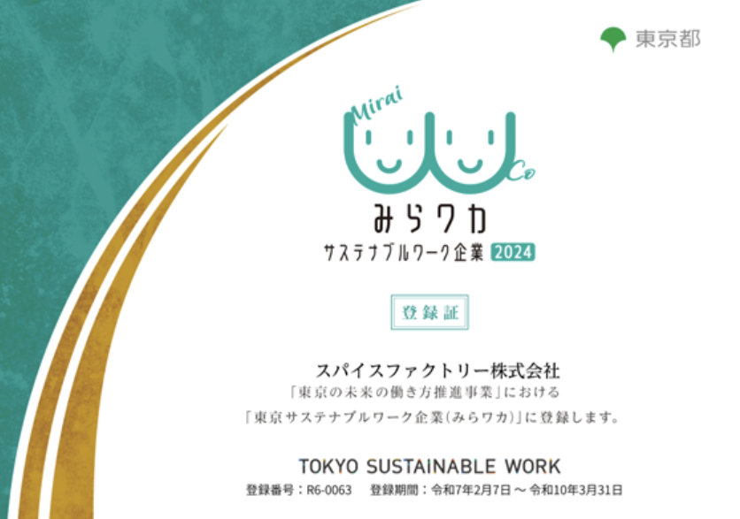 デジタル・トランスフォーメーションを⽀援するスパイスファクトリー株式会社(本社:東京都港区、代表取締役CEO:高木 広之介、以下、当社)が、「誰もが活躍できる持続可能な社会の実現」に向けて先進的な働き方を推進する企業を選出する令和7年度 「Tokyo Future Work Award」において優秀賞を受賞いたしました。