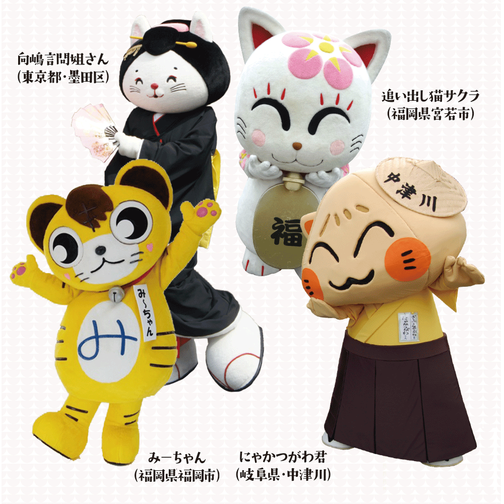 にゃかつがわ君(岐阜県中津川)、向島言問姉さん(東京都墨田区)、み〜ちゃん(福岡県福岡市)追い出し猫サクラ(福岡県宮西市)など、日本各地からご当地ねこキャラが大集合。イベントを盛り上げてくれます。