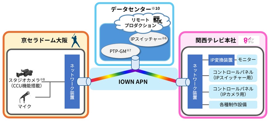 NTT西日本グループ※1は、関西テレビ放送株式会社(以下、関西テレビ)と共同で、2025年9月6日に京セラドーム大阪で開催されたプロ野球公式戦「オリックス・バファローズ 対 北海道日本ハムファイターズ」の地上波放送向け中継において、IOWNオールフォトニクス・ネットワーク(以下、「IOWN APN」)※2※3を活用し、データセンター集約型の制作設備を遠隔操作するリモートプロダクション※4環境を構築・運用しました。