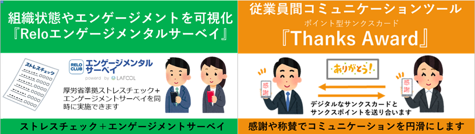 また、テレワークを含めてハイブリッド化する勤務形態の中で生じる、従業員のコミュニケーション不足。リロクラブではメンタルにおける組織状態やエンゲージメントを可視化できる『Reloエンゲージメンタルサーベイ』とポイント型従業員間コミュニケーションツール『Thanks Award』を組み合わせたサービスをご用意。貴社に必要な福利厚生サービスを一手に揃えることを可能としました。