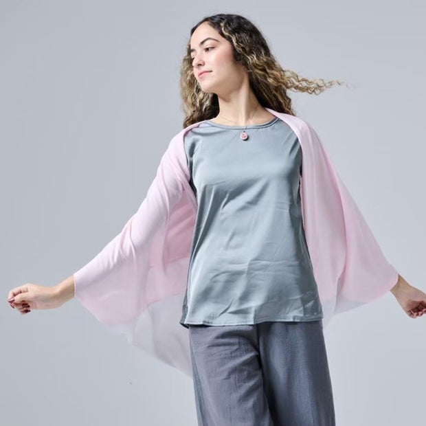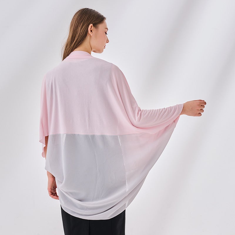 独創的な袋状の形状は、腕を通して羽織ることも、首に巻くこともできる versatile なアイテムです。ピンクのUVカット素材とグレーのシフォン素材の組み合わせにより、日中は機能性を、夕方以降はファッション性を楽しめます。