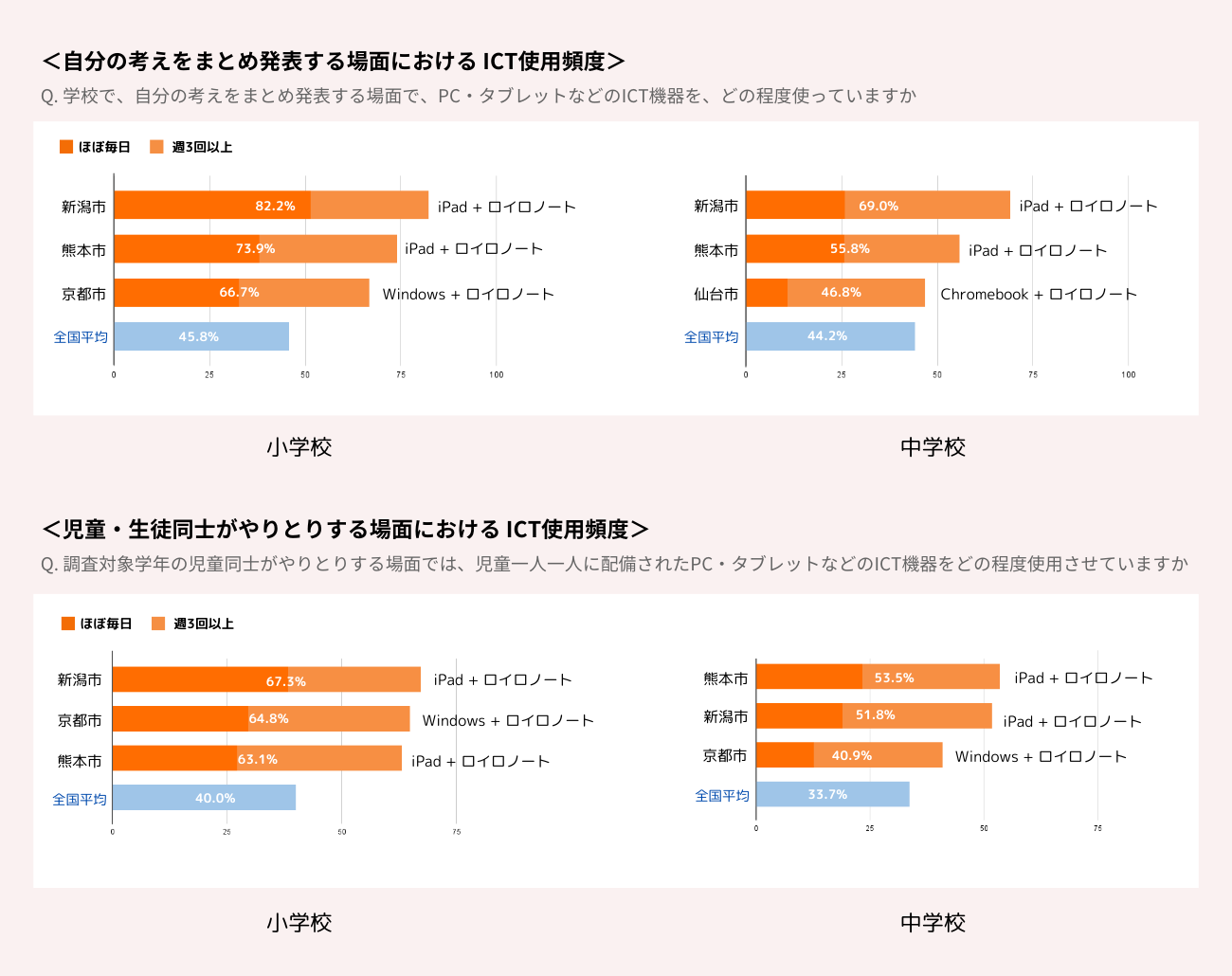 国立教育政策研究所が全国の公立小中学校を対象に実施した「令和5年度 全国学力・学習状況調査 ※1」で、主体的・対話的で深い学びにおけるICTの活用状況が調査されました。その結果、ロイロノート・スクールを導入している新潟市、熊本市、横浜市、京都市、名古屋市、仙台市の公立小中学校では、端末種別※2 を問わず効果的にICTを活用しており、ICT活用率が全国平均を上回っていることが明らかになりました 。ロイロノート・スクール導入自治体から上位3自治体の結果を報告します。