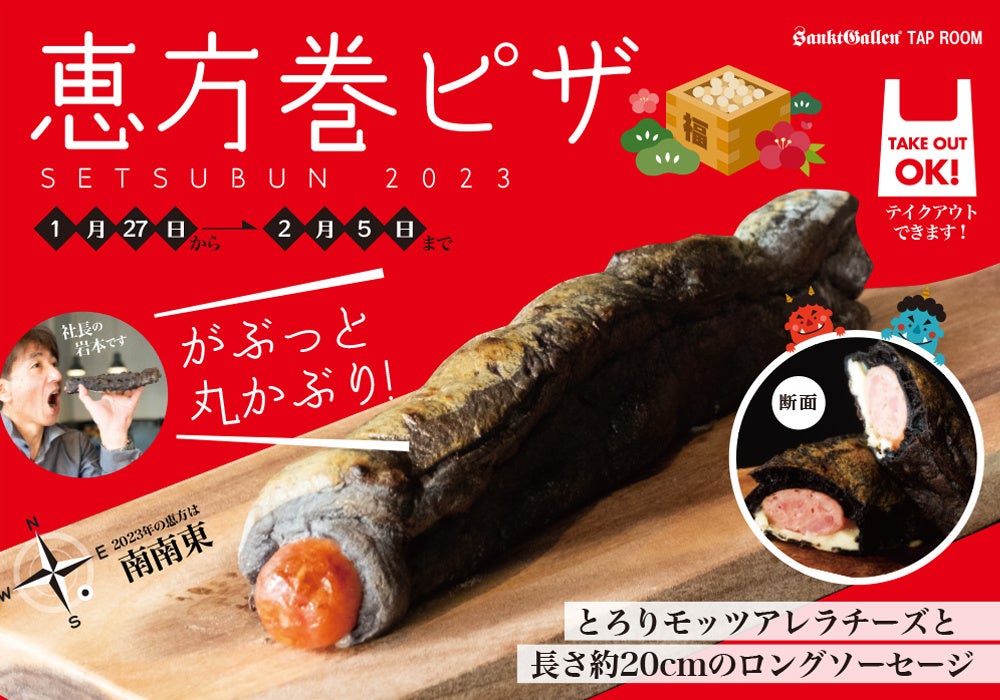 節分にピザを丸かぶり「恵方巻ピザ」2023年1月27日(金)~2月5日(日)、サンクトガーレン タップルームにて販売。黒い生地で海苔巻き風に