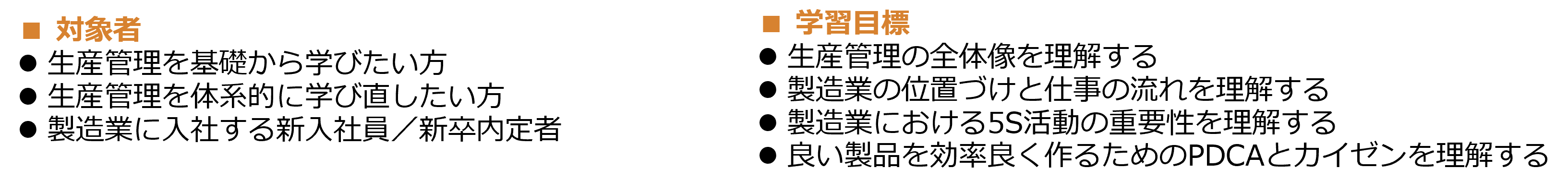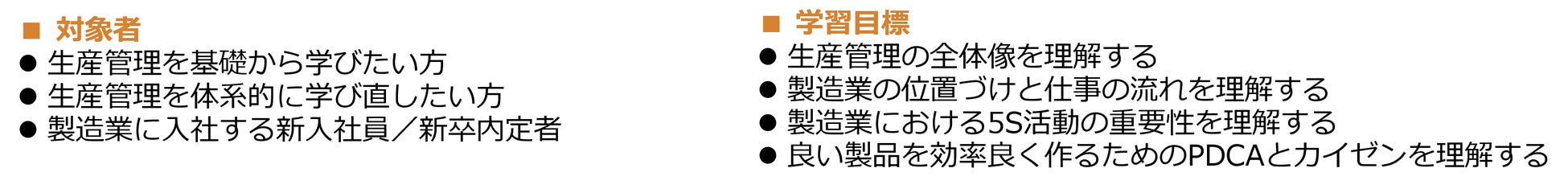 本シリーズは、製造業で働いている/これから働く方を対象に、設計開発・生産計画・在庫管理・品質管理・安全管理など、生産管理に関する基礎知識を網羅的に習得することを目的にしています。
