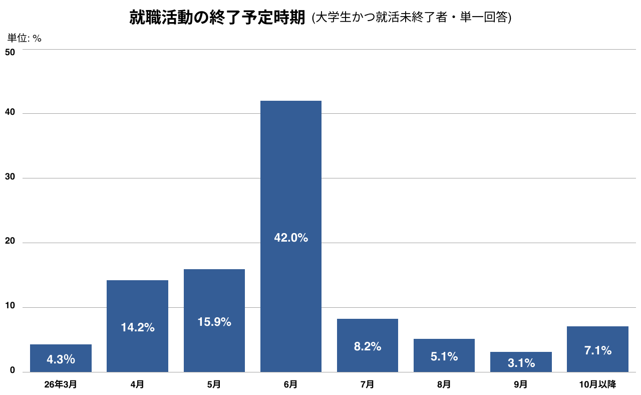 就職活動未終了者の終了予定時期は2026年6月が42.0%と群を抜いており、次いで2026年5月(15.9%)、2026年4月(14.2%)が続きます。6月末までに約7割の学生が就活を終える見込みです。