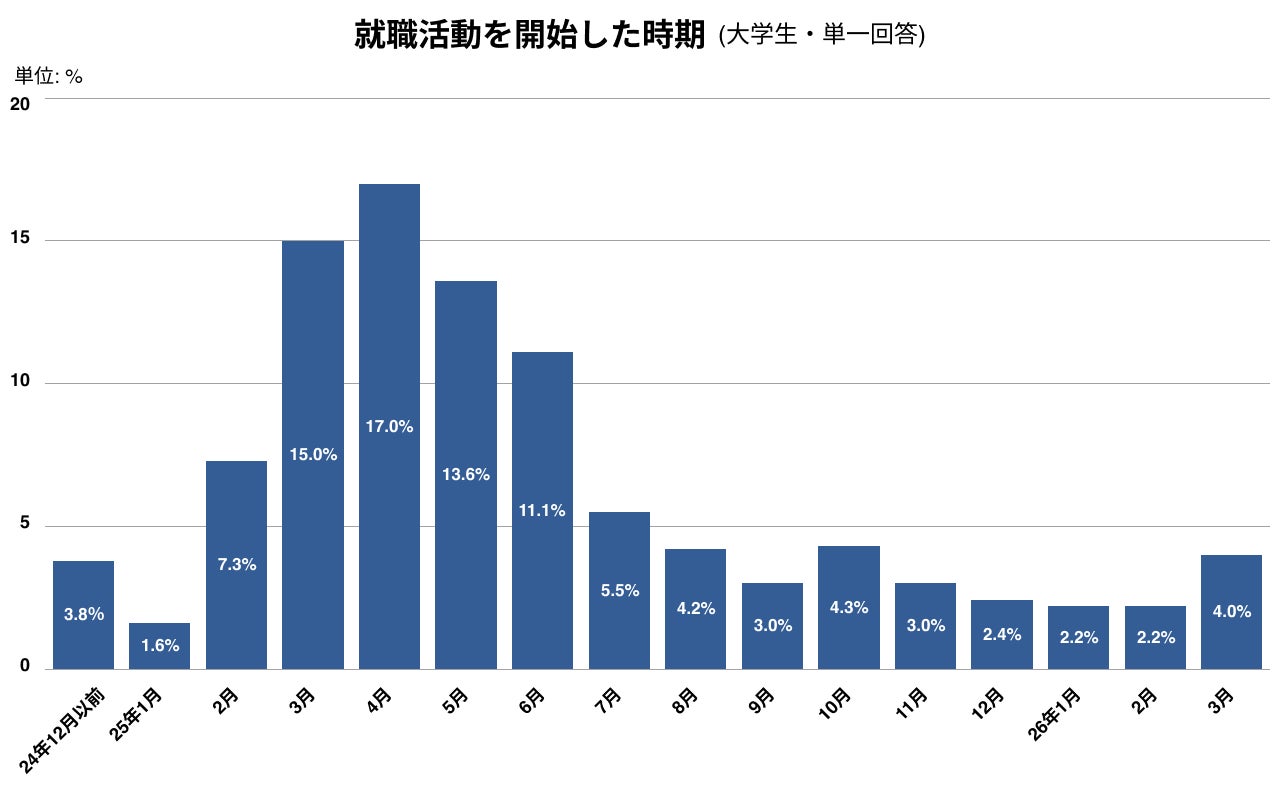 就職活動の開始時期は2025年4月が17.0%で最も多く、3月(15.0%)、5月(13.6%)が続きます。2025年3〜5月の春期に集中する一方、6月以降に開始した学生も一定数おり、開始時期のばらつきが見られます。