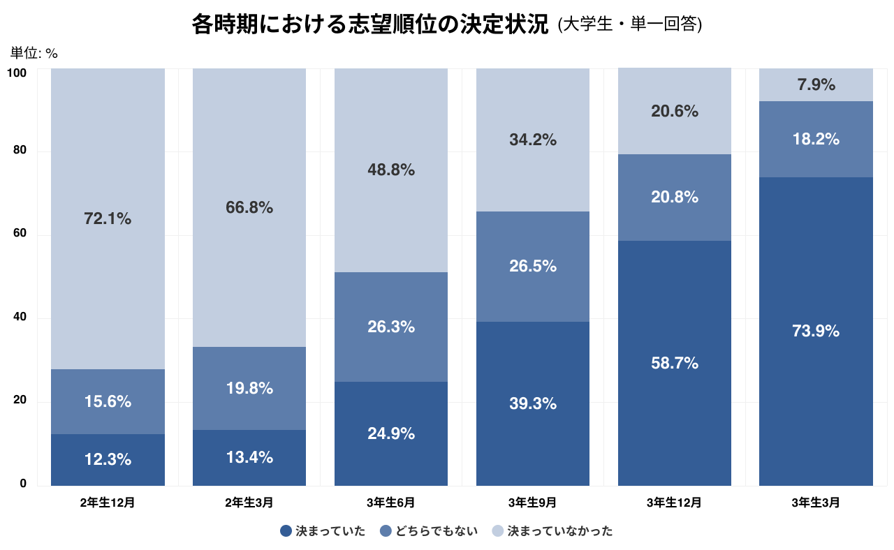 「志望順位が決まっていた」学生の割合は、2年生12月時点で12.3%だったものが、3年生12月時点では58.7%と過半数を占めています。3年生の秋以降に急速に固まる傾向があり、サマーインターンや本選考が志望順位の確定に大きく影響していることがわかります。