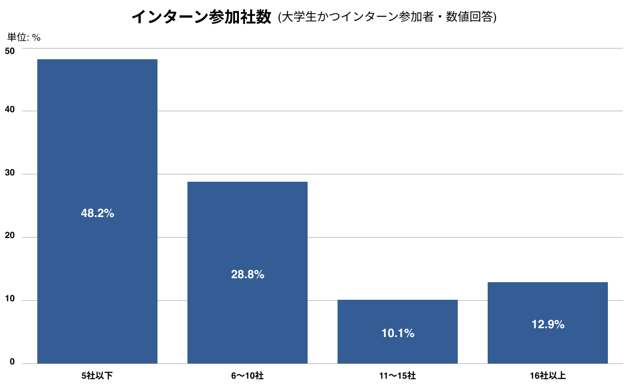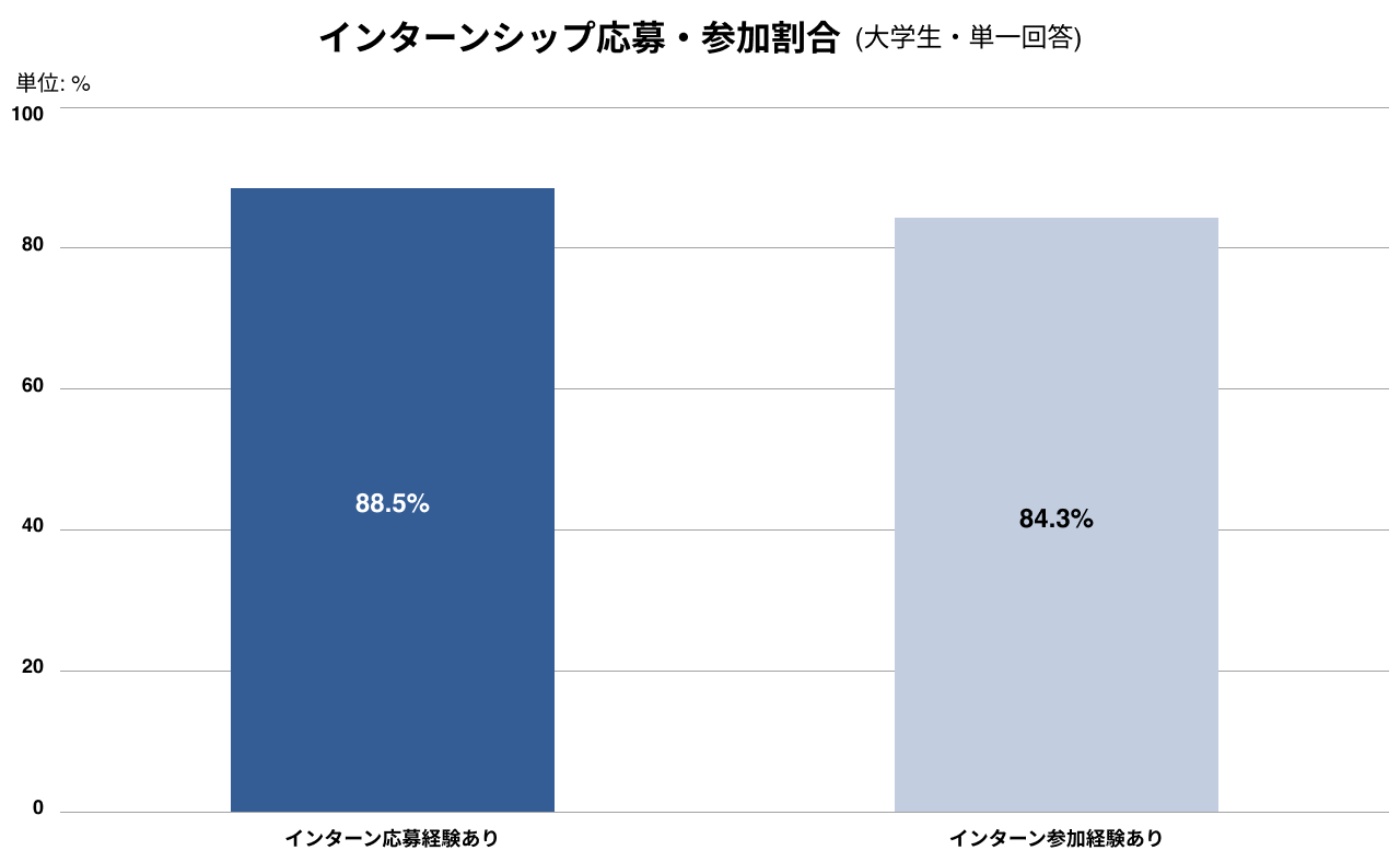 大学生全体のうち、インターンシップへの応募経験がある学生は88.5%(応募平均15.3社)、参加経験がある学生は84.3%(参加平均7.2社)に達しています。分布を見ると、応募社数は16社以上(37.9%)が最多であるのに対し、実際の参加数は5社以下(48.2%)が最多になっています。16社以上と非常に多数のインターンに参加経験がある学生も12.9%存在しています。
