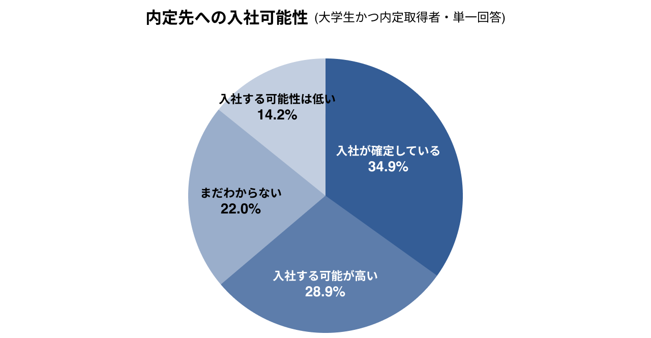 内定取得者のうち「入社が確定している」が34.9%、「入社する可能性が高い」が28.9%で、合計63.8%が現内定先への入社を前向きに検討しています。一方で「まだわからない」が22.0%、「入社する可能性は低い」が14.2%を合わせた36.2%は、いまだ入社意思が固まっていない状況です。