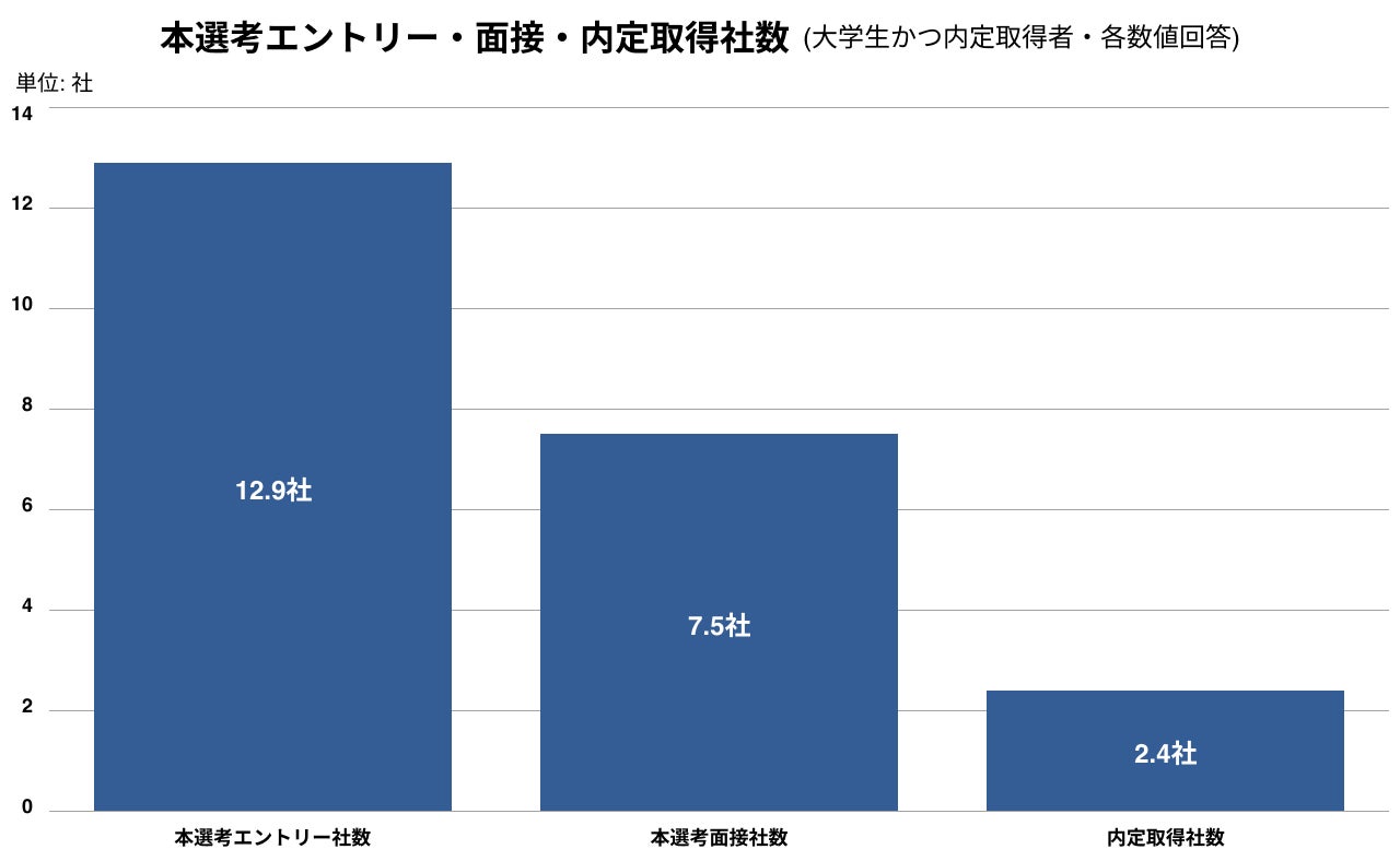 内定取得者の本選考エントリー数の平均は12.9社、面接社数は7.5社、内定社数は2.4社