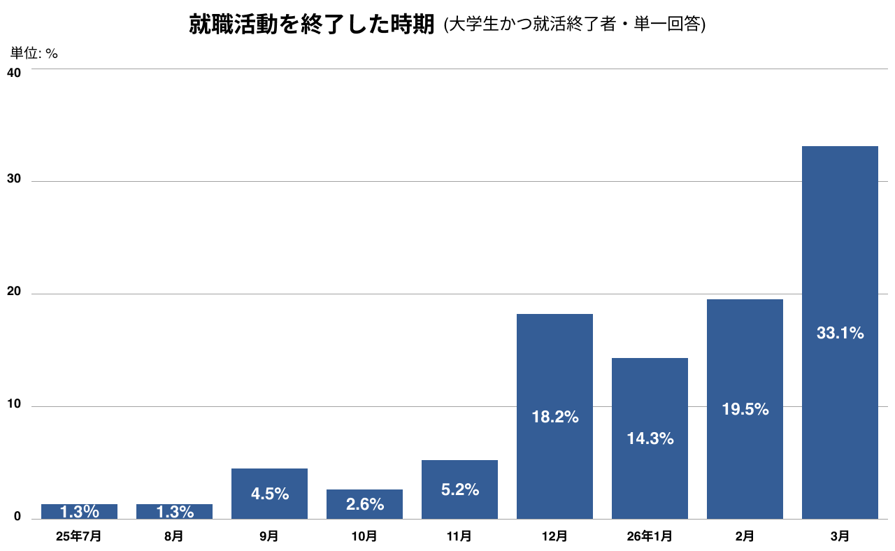就職活動終了者(全体の31.4%)のうち、2026年3月に終了した学生が33.1%で最多です。2026年2月(19.5%)、2025年12月(18.2%)と続き、3年生の冬から春にかけて終了者が急増しています。