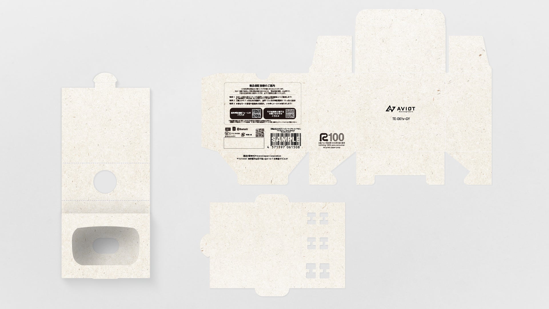 この「TE-D01v-GY」は、製品本体にナチュラルで普段使いのしやすいグレーベージュを新色として採用。また、プラスチック使用量をゼロにし、100%再生紙を使用したパッケージを使用しています。従来の製品保証登録カードをパッケージ背面に印刷するなどの効率化と、構造検討を重ねたパッケージ形状により、耐久性を担保しつつ、紙そのものの使用量の減少を実現。さらに電子廃棄物減少のため、USB Type-Cの充電ケーブルを非同梱としています。