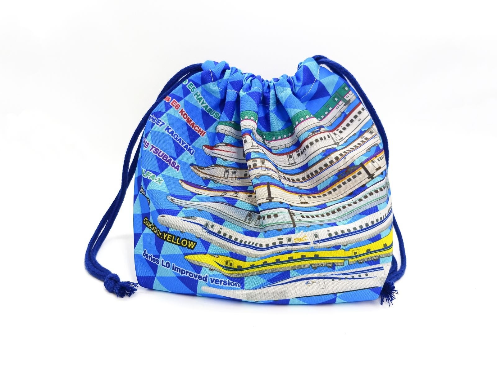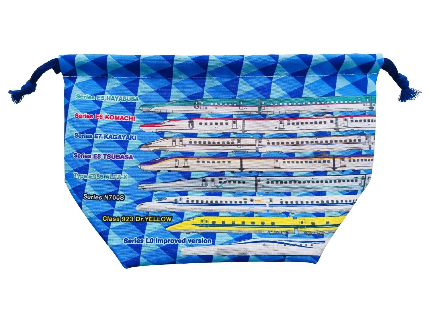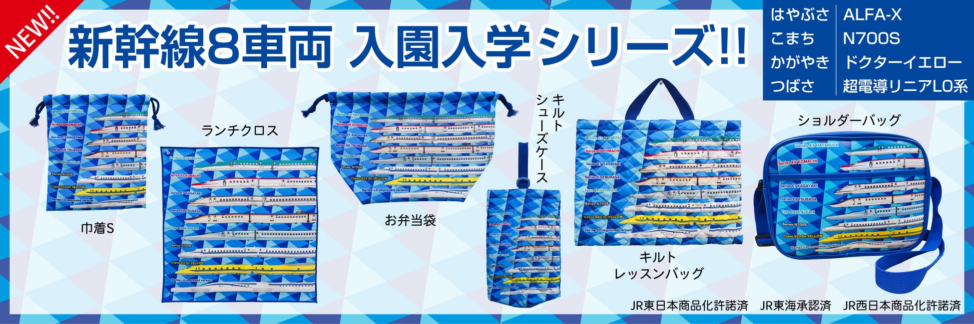 人気新幹線8車両がデザインされた、巾着S、ランチクロス、巾着お弁当袋、キルトシューズケース、キルトレッスンバッグ、ショルダーバッグが新発売!