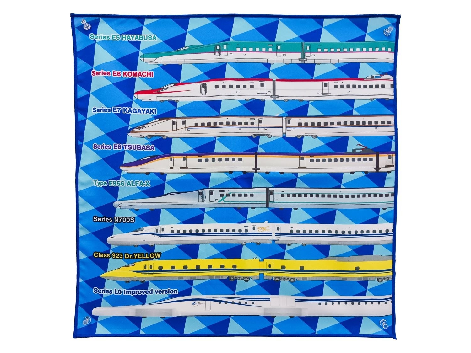 JR東日本、JR東海、JR西日本の人気の新幹線が8車両そろったデザイン(N700S・923形ドクターイエロー・E5系はやぶさ・E6系こまち・E7系かがやき・E8系つばさ・ALFA-X・超電導リニアL0系)が巾着S、ランチクロス、巾着お弁当袋、キルトシューズケース、キルトレッスンバッグ、