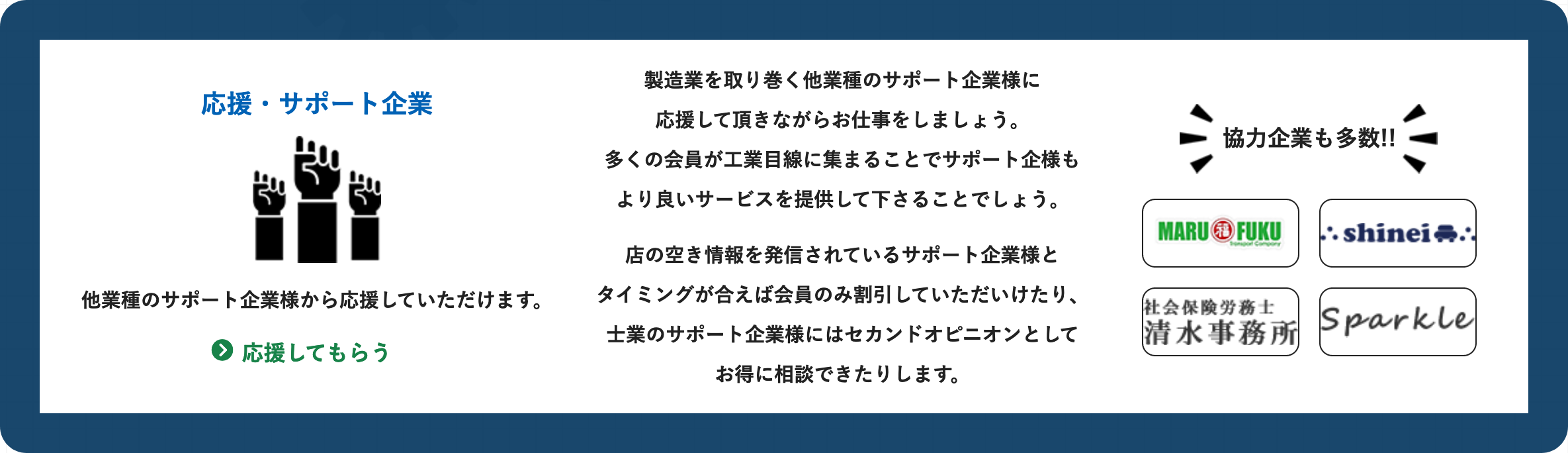 製造業を取り巻く他業種のサポート企業に応援していただきながら、お仕事をすることができます。