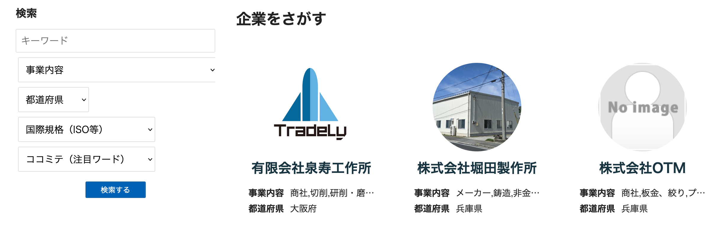 製造業独自のカテゴリーで検索するため、特定の技術・設備を持つ企業や、「急いで見積もりがほしい」「加工を依頼したい」というときなど、条件にあった企業をすばやく見つけることができます。