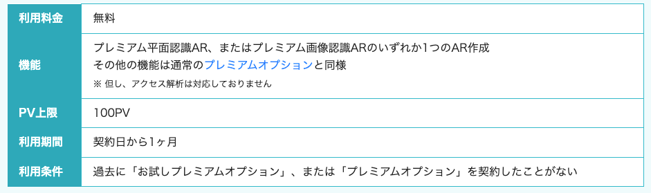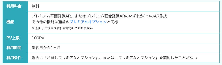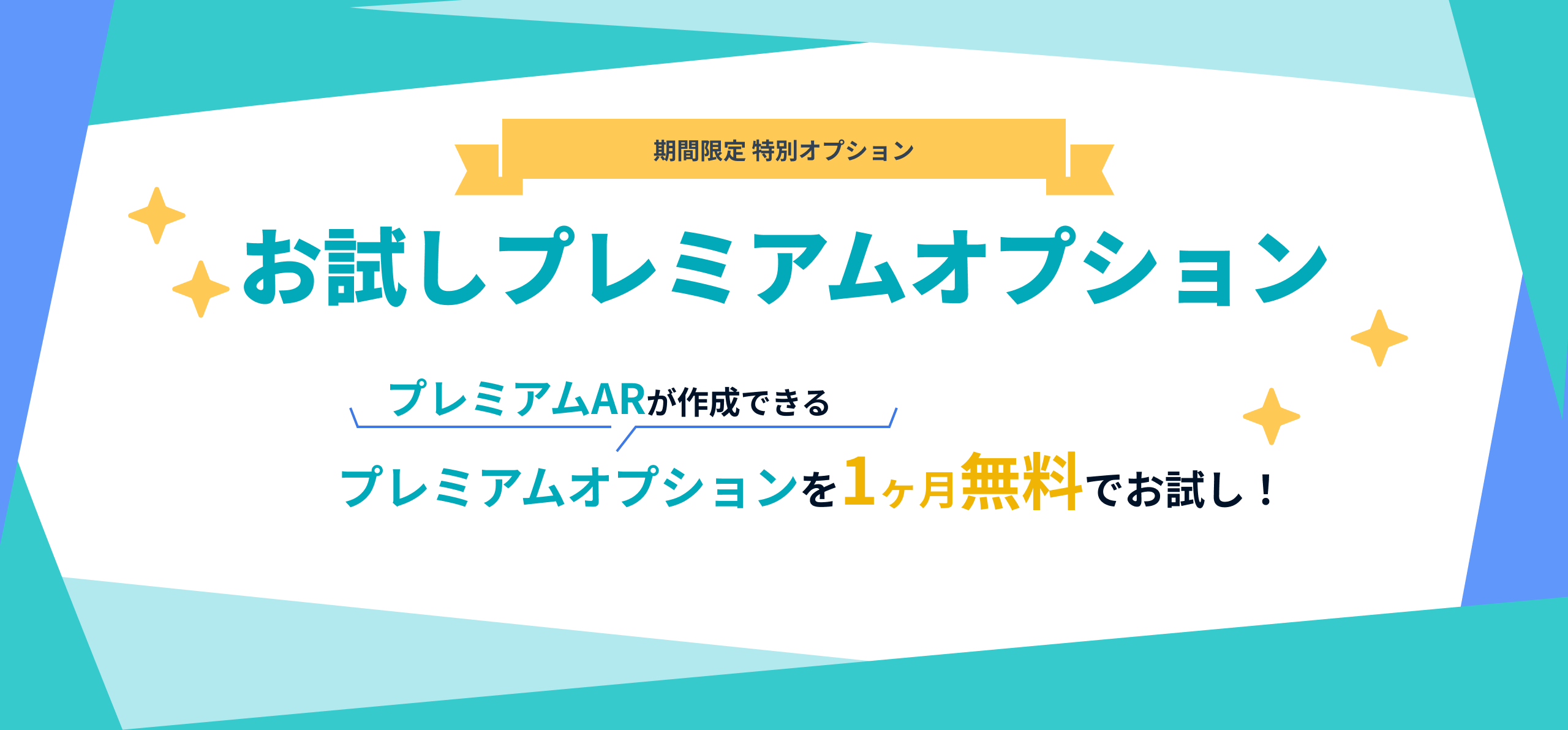 ・「お試しプレミアムオプション」で作成したARを継続して利用したい場合は、別途プレミアムオプションの契約していただき、お試しプレミアムで作成したARを複製することで、同じ内容のARを通常のプレミアムオプション契約でご利用になれます。