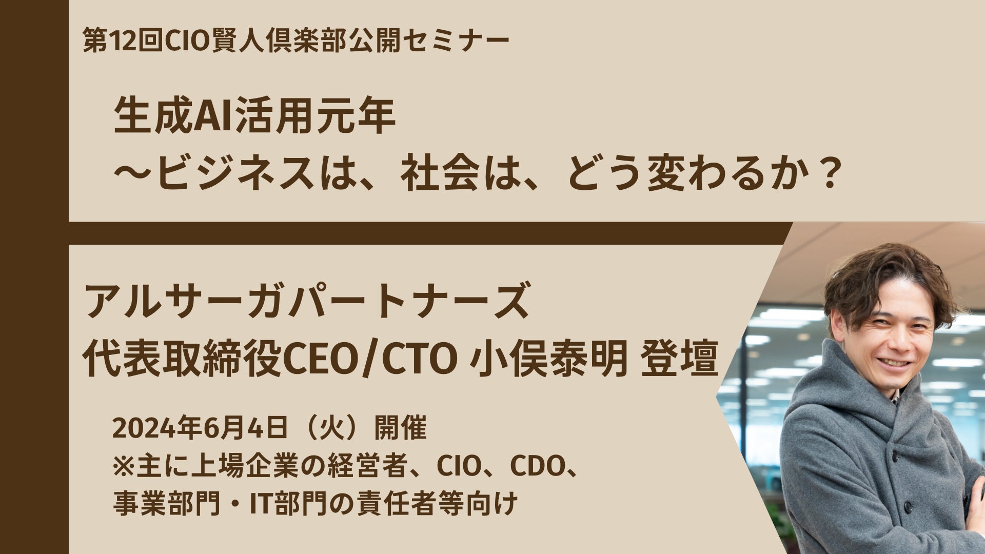 企業のDXを促進するアルサーガパートナーズ株式会社(本社:東京都渋谷区、代表取締役 /CEO・CTO:小俣泰明、以下「アルサーガパートナーズ」)の代表取締役CEO/CTO 小俣泰明が、2024年6月4日(火)13:00〜17:40に開催される公開セミナー「生成AI元年〜ビジネスは、社会は、どう変わるか?」に登壇します。同セミナーではデジタル社会での生成AIにフォーカスしながら、これからの社会変革を考え、活用事例の発表や公開討論を行います。