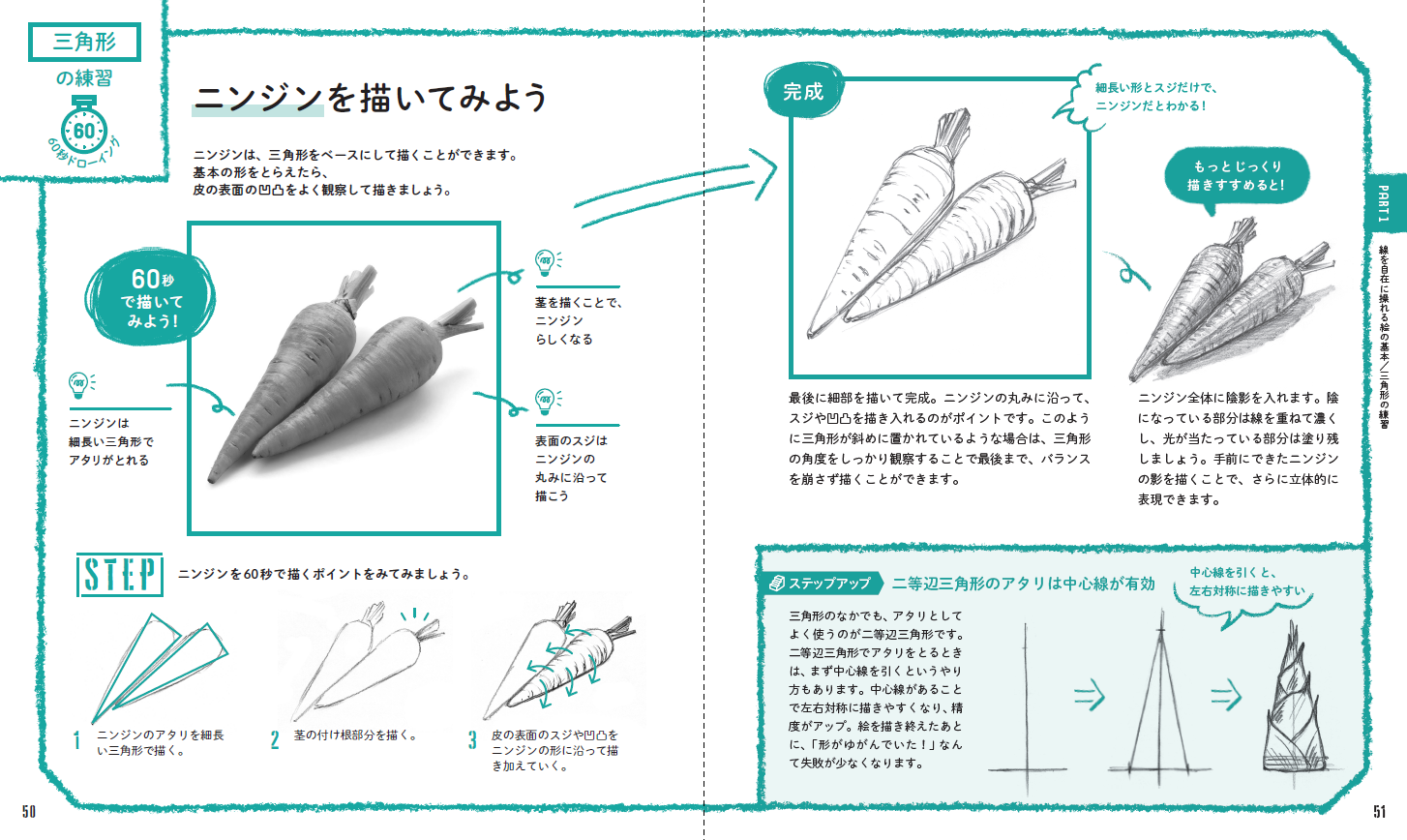 本書では60秒右脳ドローイングを効果的に使いながら、アタリのとり方、影の付け方、立体感や質感の出し方といったデッサンの基礎的なテクニックもわかりやすく解説しています。