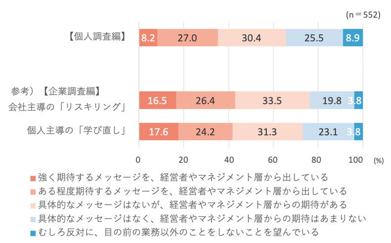 貴社において、従業員に会社主導の「リスキリング」および個人主導の「学び直し」それぞれを期待するメッセージはどの程度発信されていますか。