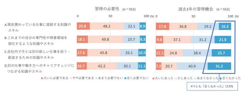 ・A、B、C、Dの4つとも習得機会が「全くなかった」を選択したのは13.9%であった。すなわち、9割近くにのぼる86.1%はA、B、C、Dのいずれか1つ以上の新しい知識・スキルの習得機会があったことになる。