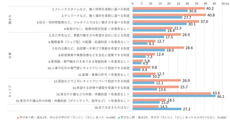 ・2群間の得点差が大きかったのは、「12.面談などで上司にキャリアについて相談できる制度」(学びあり群26.9%、学びなし群12.1%、得点差14.7pt)、「2.テレワークなど、働く場所を柔軟に選べる制度」(同40.8%、27.7%、13.1pt)、「13.希望する研修や講習を受講できる制度」(同25.7%、13.6%、12.1pt)、「7.社内公募など、他部署へ手挙げで異動を希望する制度」(同28.6%、18.0%、10.7pt)。