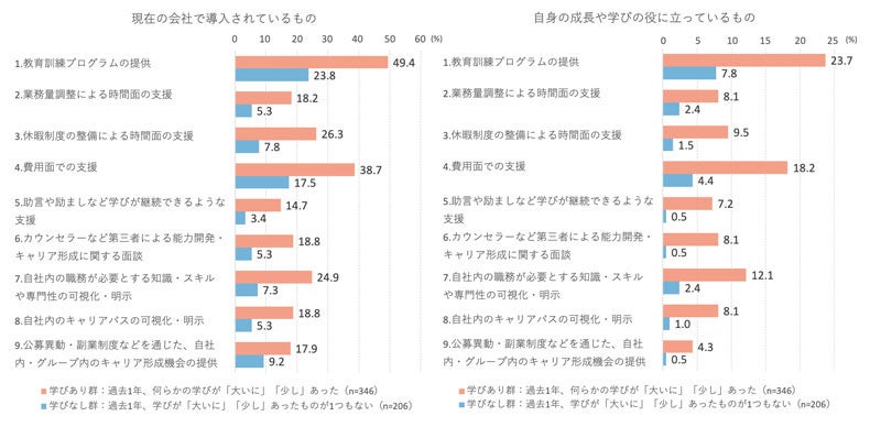 ・過去1年の仕事に関する新しい知識・スキルの習得(図表1)において、いずれかに「大いにあった」「少しあった」と回答した「学びあり群」と、「大いにあった」「少しあった」が1つもなかった「学びなし群」に分け、自社の知識・スキル習得支援の制度や仕組みとして導入されているもの、役立っているものの選択率を確認した。
