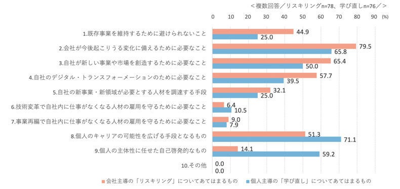 ・【企業調査編】では、企業主導の「リスキリング」と個人主導の「学び直し」ごとに一部傾向の違いはあるものの(「9.個人の主体性に任せた自己啓発的なもの」など)、設問間の高低については、おおむね個人調査と企業調査は同様の傾向。