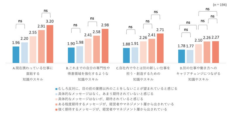 ※新しい知識・スキルの習得機会について、「4:大いにあった、3:少しあった、2:あまりなかった、1:全くなかった」として、メッセージの発信状況別に平均値を算出