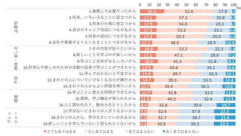過去1年で、仕事に関する新しい知識やスキルについて学ぶ機会があったという方にお聞きします。あなたが学んだ理由として、次のことはどの程度あてはまりますか。