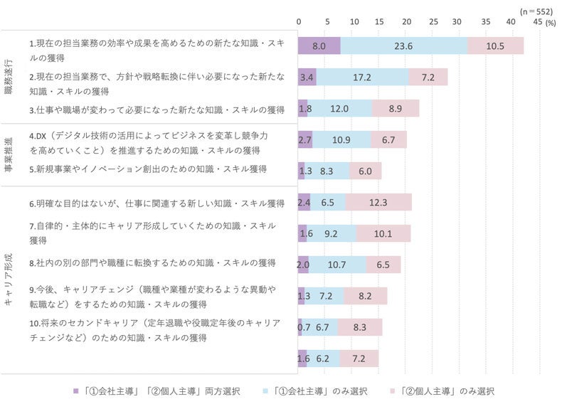 ・①の会社主導のみの場合は、会社の制度による機会提供がなければ学んでいない可能性もあり、会社の制度による機会提供の有効性がうかがえる。