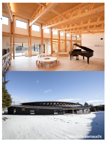 軽井沢の避暑地につくられた認可保育所。保育方針のひとつに「グローバル社会で活躍できる人間」を掲げ、普段の活動の中にSDGs教育を取り入れるなど、社会と子供たちとの関りを大切にした保育運営の舞台となる施設づくりが行われている。一枚の葉に見立てた大きな屋根の下に、軽井沢の森と呼応するような自然の温もりを感じられる室内環境が用意された。自然とともに過ごすこの場所での時間が、子供たちの心に大切な記憶として刻まれることを願ってやまない。