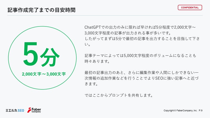 本資料では2,000〜3,000文字程度の記事がChatGPTで出力される目安時間を「5分」程度と定めています。ご紹介するプロンプトはあくまで「編集を人力で行う」ことを前提としているため、ChatGPTでの出力結果を必ず確認し、情報の正確性を担保することを推奨いたします。