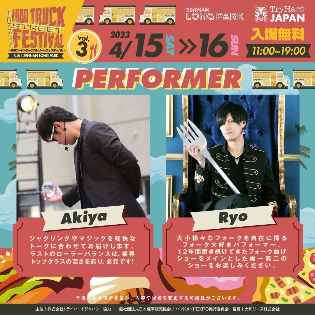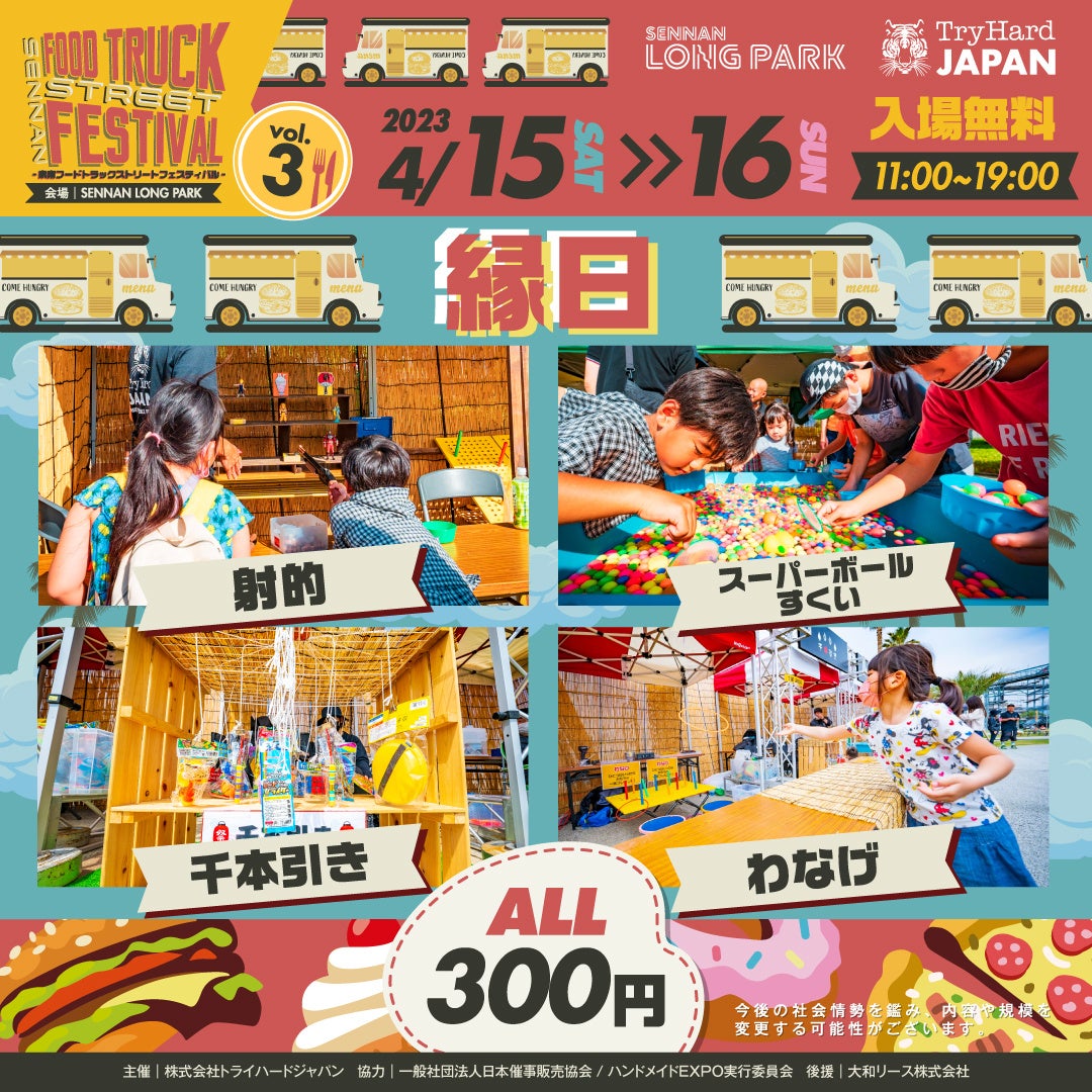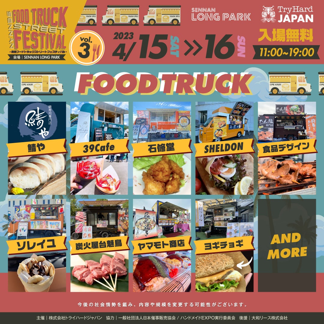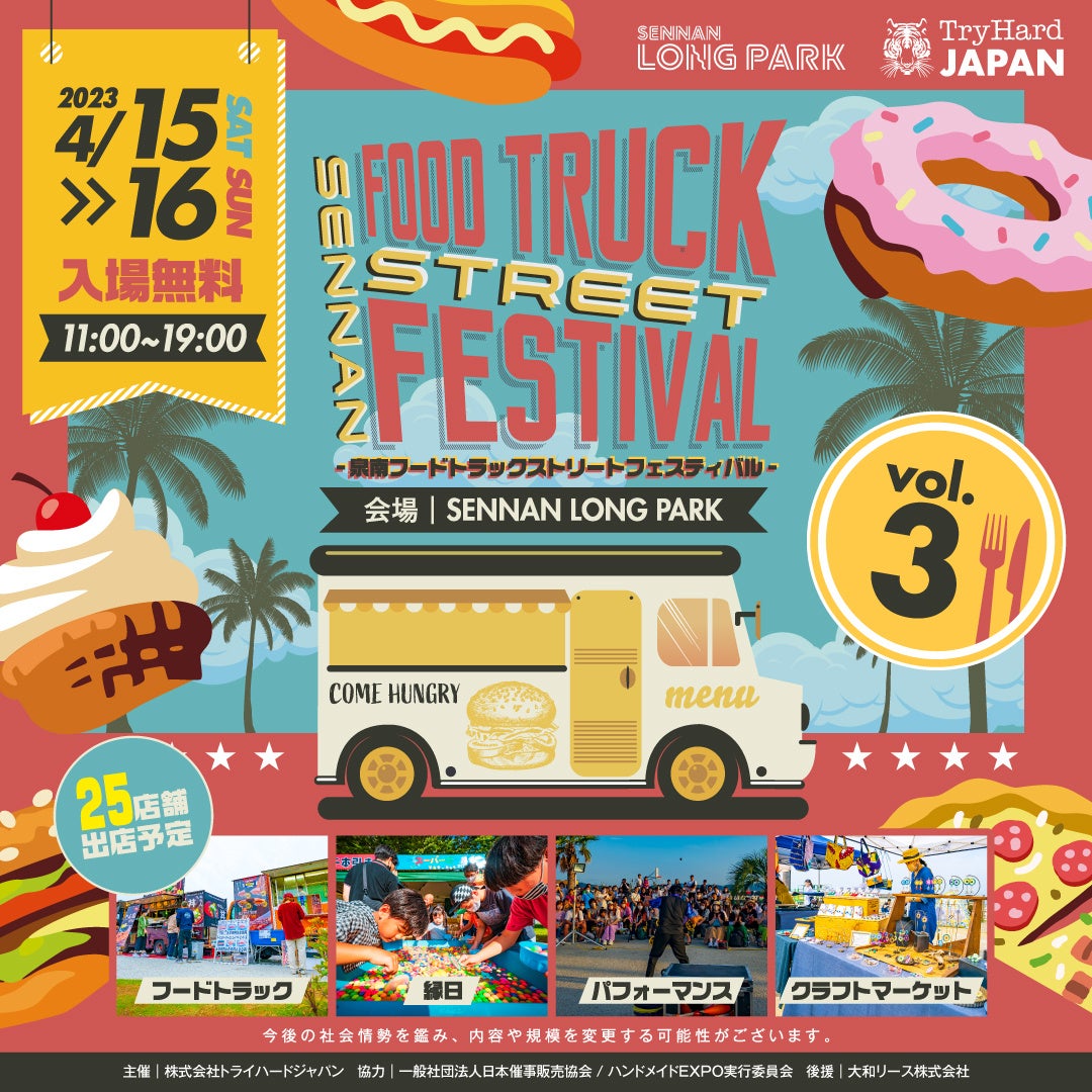 株式会社トライハードジャパン(所在地:大阪市中央区)は、2023年4月15日(土)、16日(日)の2日間、SENNAN LONG PARK(センナンロングパーク)(所在地:大阪府泉南市)にて、フードトラックの祭典「FOOD TRUCK STREET FESTIVALvol.3」を開催いたします。