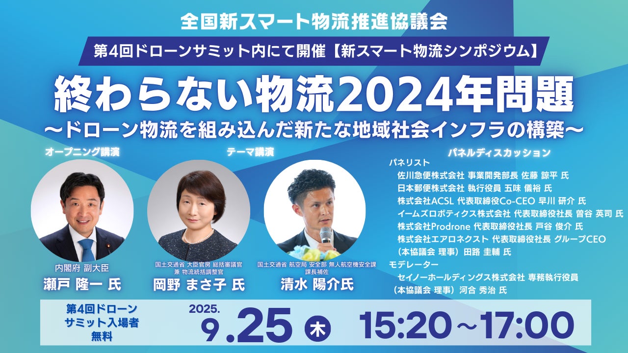 さらに、9月25日(木)には、本協議会企画で「終わらない物流2024年問題~ドローン物流を組み込んだ新たな地域社会インフラの構築」をテーマに開催される「新スマート物流シンポジウム」に、代表取締役社長 グループCEOの田路がパネルディスカッションに登壇します。
