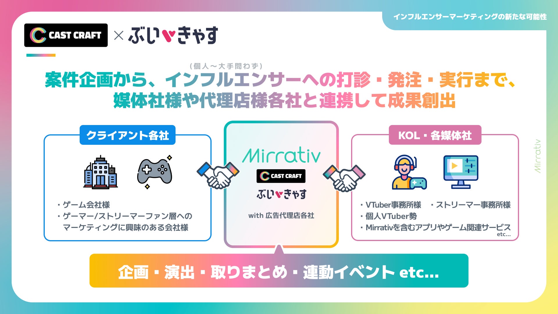 本キャンペーンでは、YouTubeやTwitchでPR案件を予定しているクライアント・広告代理店に向けて、CastCraftと連携した演出付きのPR配信を先着3社様限定で無償制作(※キャスティング費用は別途)する特別プランをご提供。ゲーム会社様はもちろん、広告代理店・コンテンツホルダーなど、配信を活用した商品・サービスのプロモーションをご検討中の皆さまへ幅広くご活用いただけます。