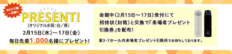 会場に招待状(封筒)をご持参いただきますと、毎日先着1000名様にギフト・ショーオリジナルグッズをプレゼントします。ぜひ、お早目にご来場ください。