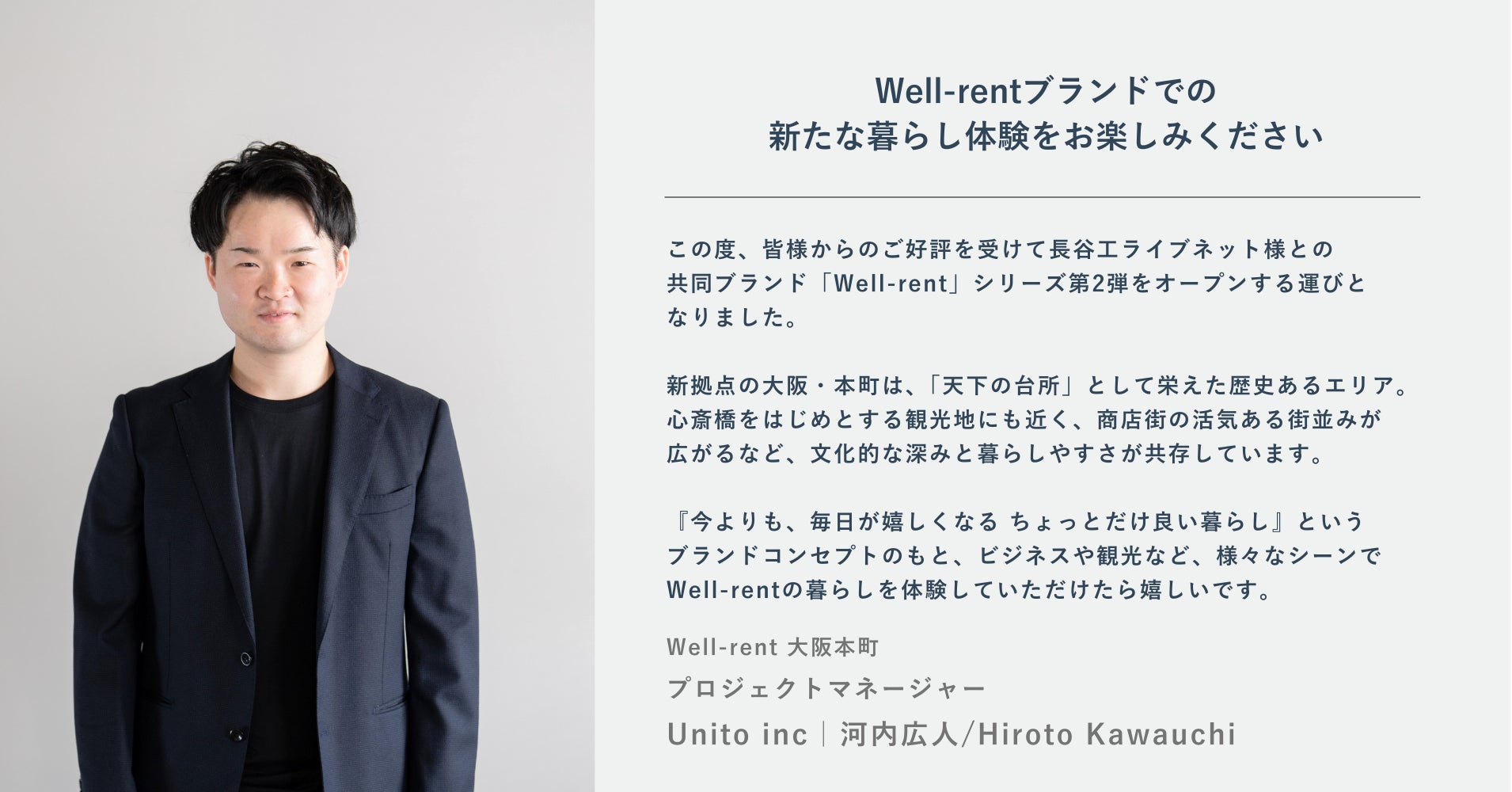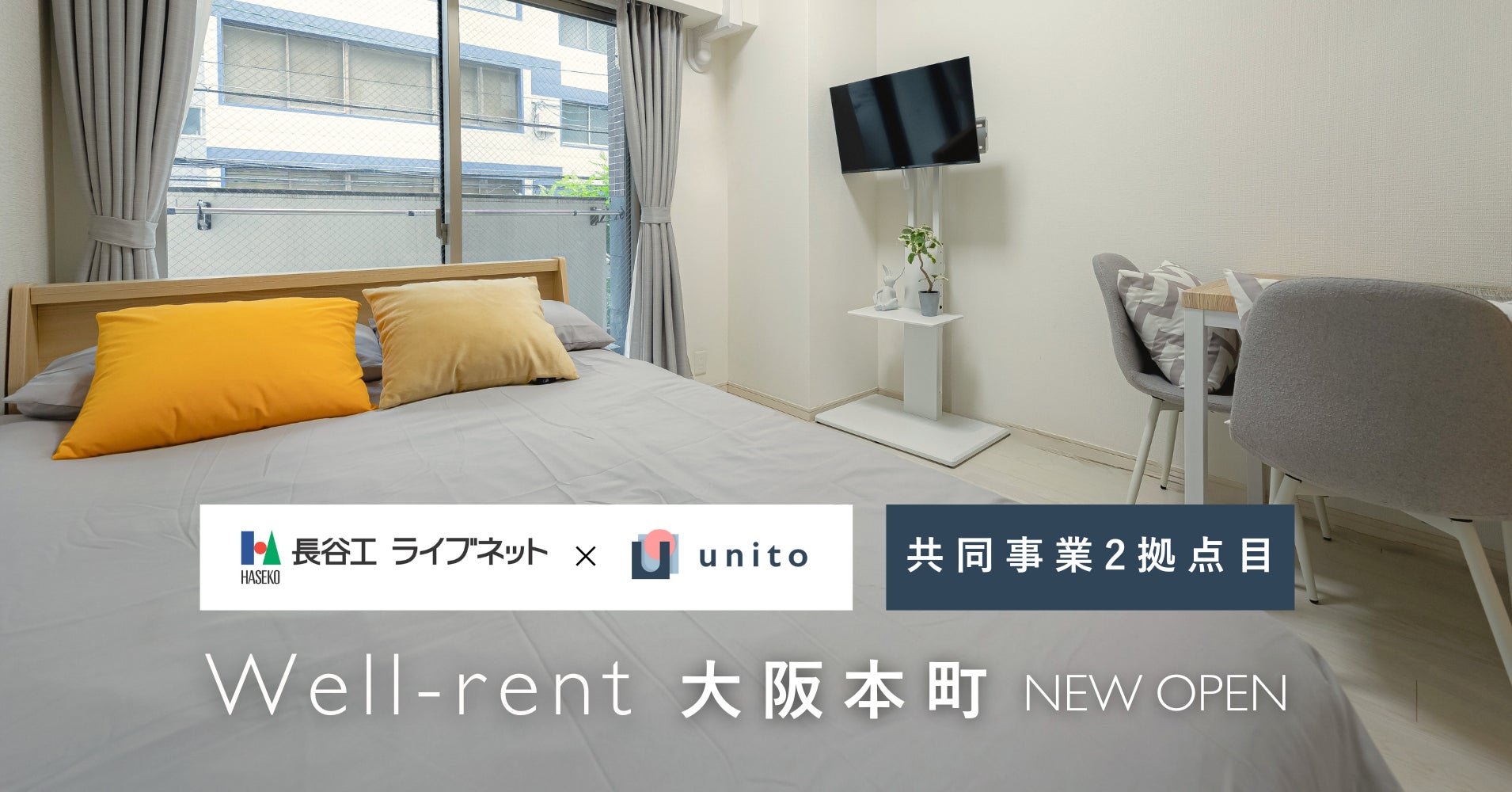 株式会社Unito(本社:東京都目黒区、代表取締役:近藤佑太朗、以下「Unito」)は、株式会社長谷工ライブネット(本社:東京都港区、代表取締役社長:松田隆幸、以下「長谷工ライブネット」)との共同事業である、サービスアパートメントブランドの2拠点目として「Well-rent 大阪本町(読み方:ウェルレント オオサカホンマチ)」をオープンしました。