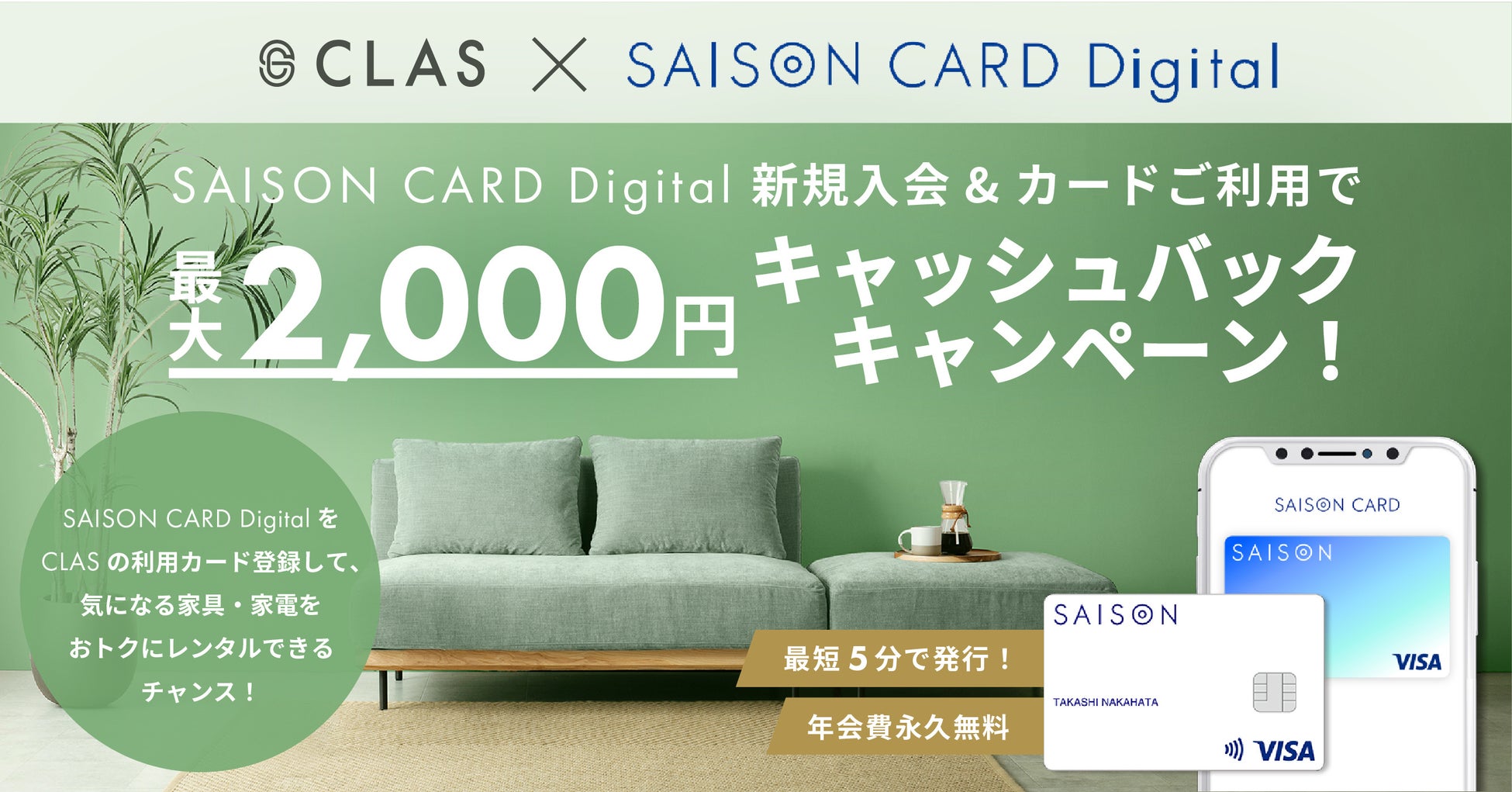 【気になる家具・家電をおトクにレンタル!】CLAS、クレディセゾン「SAISON CARD Digital」への新規入会で最大2,000円キャッシュバックキャンペーンを実施