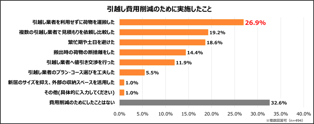 また、引越し費用削減のために実施したことについては、「引越し業者を利用せずに荷物を運搬した」(26.9%)が比較的多く、次いで「複数の引越し業者で見積もりを依頼し比較した」(19.2%)、「繁忙期や土日を避けた」(18.6%)が続きました。そのほか、「搬出時の荷物の断捨離をした」(14.4%)、「引越し業者へ値引き交渉を行った」(11.9%)など、費用を抑えるための具体的な工夫も見られます。
