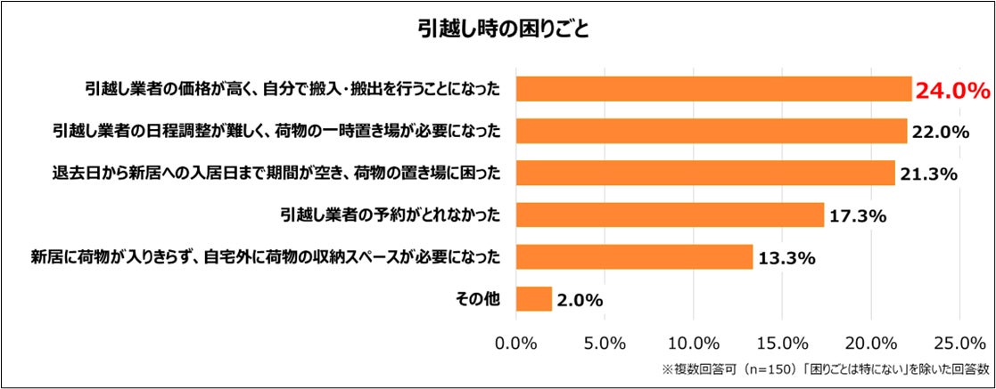 引越し時の困りごとについては、「引越し業者の価格が高く、自分で搬入・搬出を行うことになった」が 24.0% で最多となりました。次いで、「引越し業者の日程調整が難しく、荷物の一時置き場が必要になった」(22.0%)、「退去日から新居への入居日まで期間が空き、荷物の置き場に困った」(21.3%)が続いています。